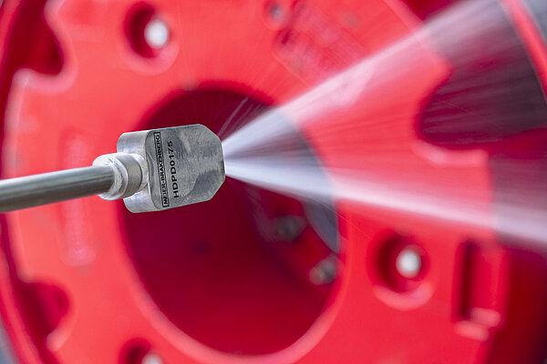Beeindruckt von dem geringen Gewicht, stellten Martin Zäh und profi-Fotograf Stefan Tovornik fest, dass die Pendellanze einen 25° Sprühkegel unterschiedlich stark ausfüllt. Der Wasserstrahl ist mal im oberen, mal im unteren Bereich etwas kräftiger, da dieser mit einer 50 kHz-Frequenz pendelt und so ein starkes Reinigungsergebnis erzielt.Kombiniert werden bei der Pendellanze die Vorteile der Flachstrahl- und der Rotordüse – das ist einerseits die Bündelung des Wasserstrahls und andererseits die Pendelbewegung, wodurch die Schneidwirkung der Dreckfräse ausbleibt. "Der Wasserstrahl aus der Pendeldüse ist tatsächlich energischer als der aus einer Flachstrahldüse", so Zäh.