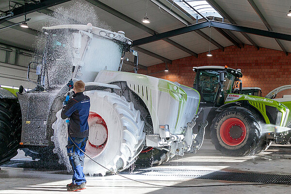 In der Waschhalle des Lohnunternehmers Schafmeister in Ostwestfalen-Lippe kann an vier Waschplätzen gleichzeitig mit bis zu 6 Personen gereinigt werden: mit Warm- und Kaltwasser oder auch mit automatischer Reinigungsmittelzudosierung zum Einschäumen der Fahrzeuge. Dazu ist die Anlage mit zwei frequenzgeregelten Hochdruckreinigern mit jeweils 4200 Liter Wasser pro Stunde und einer Warmwasserpumpe ausgestattet, die eine Zulauftemperatur von bis zu 80 °Grad heißem Wasser aufnehmen kann.