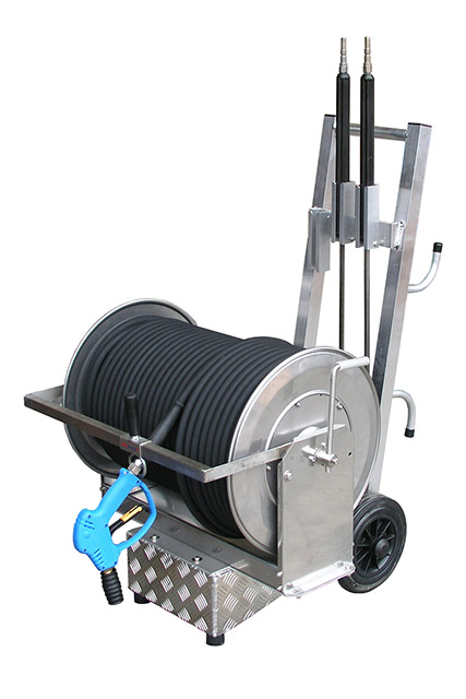 Mit dem Schlauchwagen werden Schläuche und Lanzen leicht und bequem von einer Zapfstelle zur nächsten transportiert. Das Aluminiumfahrgestell ist handlich und standsicher zugleich. Es ist mit einem Edelstahlschlauchroller und Lanzenhaltern bestückt. Der Anbau von Schlauchhaspeln für Schlauchlängen von 35 m bis 120 m ist möglich.